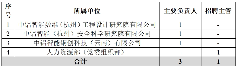 詳見(jiàn)《中鋁智能科技發(fā)展有限公司面向社會(huì)公開(kāi)招聘崗位一覽表》(附件1)。