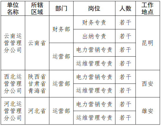 根據(jù)業(yè)務(wù)發(fā)展需要,現(xiàn)面向社會(包括中電工程本部及所屬企業(yè))開展開發(fā)投資公司云南、西北、河北運營管理分公司相關(guān)崗位招聘工作,具體招聘事項公告如下: