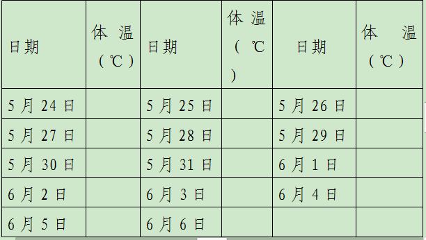 備注:1.考生應按上表每日測量體溫、進行健康監(jiān)測,如出現(xiàn)發(fā)熱、干咳、流涕等可疑癥狀應及時就醫(yī)。2.入場攜帶本承諾書、核酸檢測證明連同彩打的云南健康碼、通信大數(shù)據(jù)行程卡交考點、考場查驗。3.考生對所填內(nèi)容真實性負責。