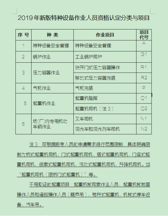 起重機(jī)指揮證(Q1)、橋式起重機(jī)司機(jī) (Q2)、門式起重機(jī)司機(jī)(2)、塔式起重機(jī)司機(jī)(Q2)、門座式起重機(jī)司機(jī)(Q2)、升降機(jī)司機(jī)(Q2)、流動(dòng)式起重機(jī)司機(jī)(Q2)、纜索式起重機(jī)司機(jī) (Q2)。