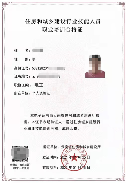 1、建筑電工證,由“云南住房和城鄉(xiāng)建設(shè)廳”頒發(fā),證書每2年進(jìn)行一次“再教育繼續(xù)學(xué)習(xí)”,如果證書過期將需要重新考取!